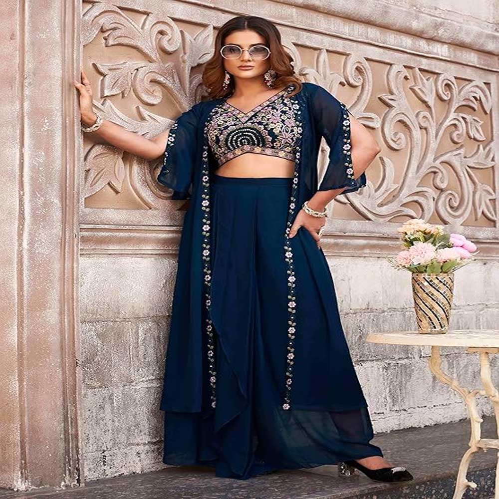 • Pack of 3 Embroidered set with Jacket -: Top Style – Short Top : Top Fabric –Georgette , Bottom Style – Skirt :Pant Fabric – Georgette ; Color : Teal , Jacket Fabric – Georgette ;
